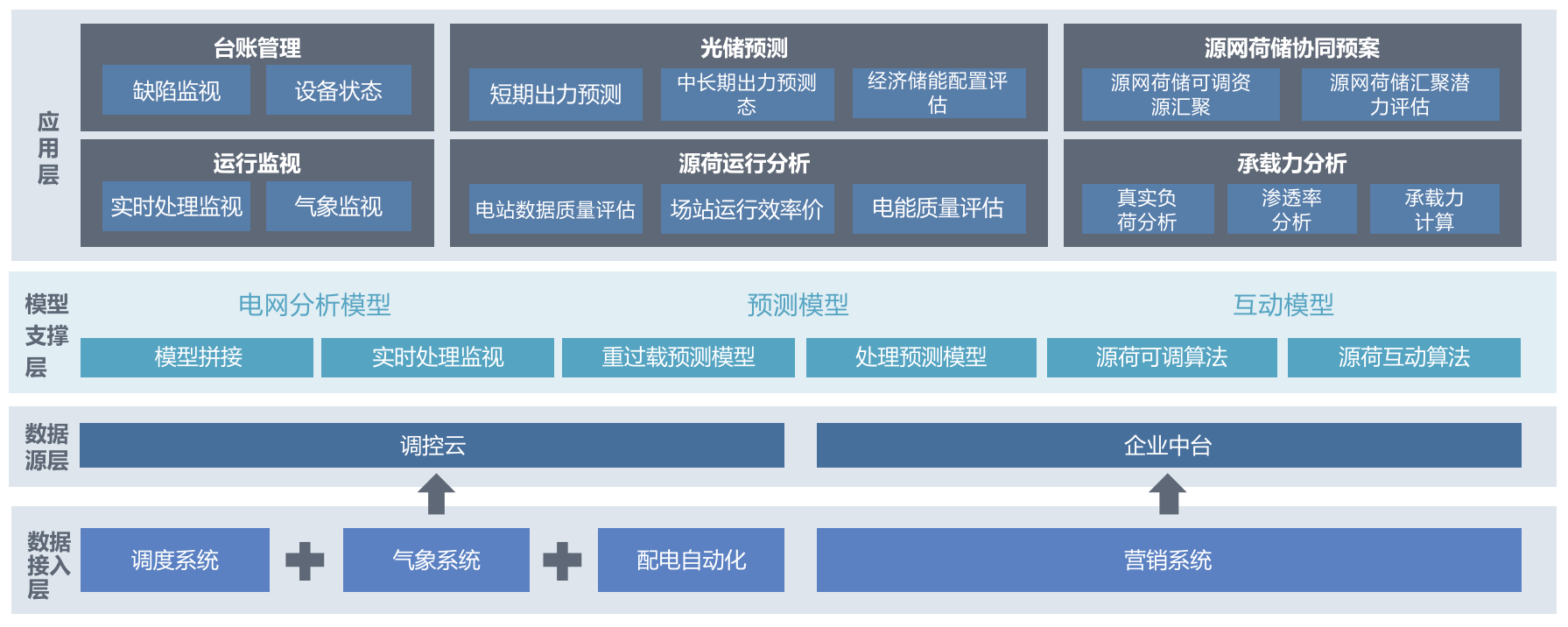 重點(diǎn)解決分布式能源多源數(shù)據(jù)融合和分析力度有限的業(yè)務(wù)痛點(diǎn),以新能源采集為數(shù)據(jù)基礎(chǔ),充分考慮分布式能源接入配網(wǎng)影響因素,構(gòu)建分布式能源接入電網(wǎng)引導(dǎo)合理布局、裝機(jī)規(guī)模規(guī)劃與協(xié)同應(yīng)用分析應(yīng)用規(guī)劃,實(shí)現(xiàn)新型電力系統(tǒng)下配網(wǎng)供電能力輔助應(yīng)用、分布式能源全景可視化、承載力分析、風(fēng)險(xiǎn)識(shí)別、光伏出力預(yù)測(cè)、經(jīng)濟(jì)儲(chǔ)能評(píng)估、消納能力評(píng)估、源網(wǎng)荷儲(chǔ)協(xié)同互動(dòng)等應(yīng)用場(chǎng)景。