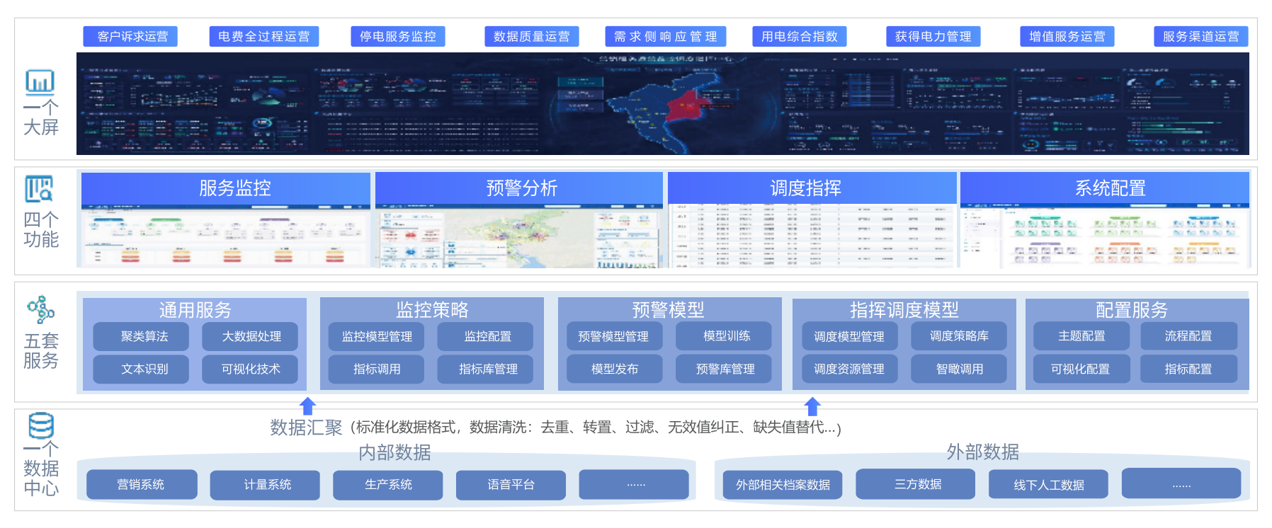 覆蓋客戶訴求運營、電費運營、停電服務監(jiān)控、數(shù)據(jù)質量運營、需求側響應管理、用電綜合指數(shù)、獲得電力管理、
