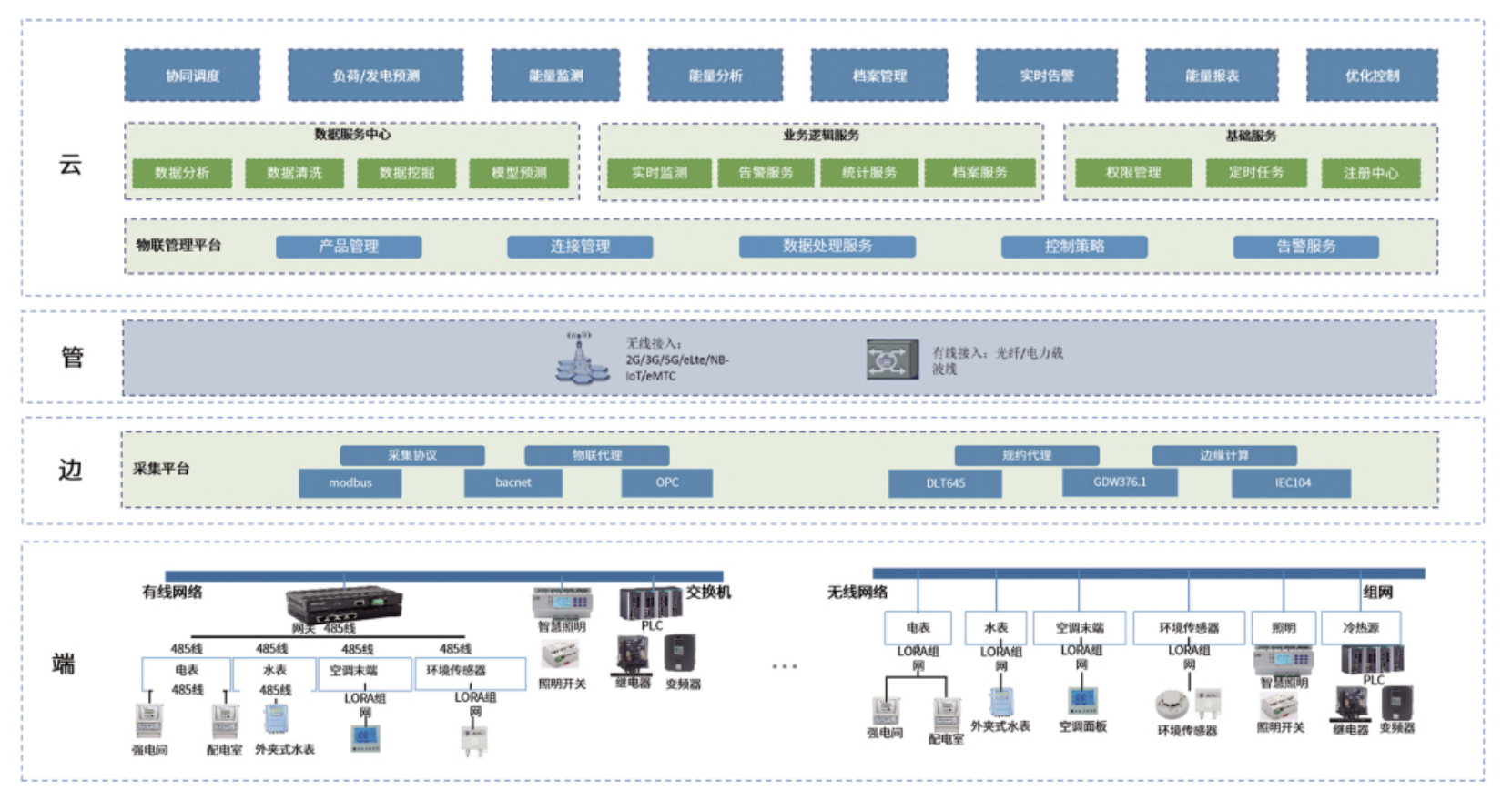 園區(qū)低碳智慧能源管理系統(tǒng)通過自動采集現(xiàn)場設(shè)備、儀表實(shí)時數(shù)據(jù)以及人工錄入的基礎(chǔ)資源數(shù)據(jù),利用計(jì)算機(jī)網(wǎng)絡(luò)送入系統(tǒng)數(shù)據(jù)庫進(jìn)行存檔、統(tǒng)計(jì)和分析,實(shí)現(xiàn)負(fù)荷預(yù)測和源網(wǎng)荷儲協(xié)同調(diào)度,還可與企業(yè)的設(shè)備、庫存以及工序、成本管理系統(tǒng)進(jìn)行數(shù)據(jù)融合,實(shí)現(xiàn)資源節(jié)約效果和環(huán)保收益核算,實(shí)現(xiàn)設(shè)備的高效運(yùn)行。