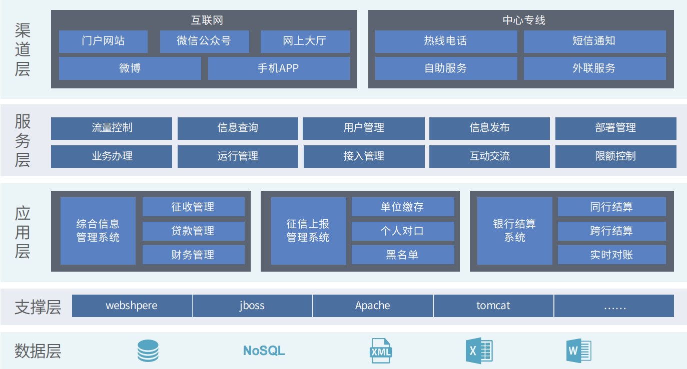 住房公積金綜合服務(wù)平臺主體建設(shè)依據(jù)住房和城鄉(xiāng)建設(shè)部發(fā)布的《住房公積金信 息化建設(shè)導(dǎo)則》、《住房公積金基礎(chǔ)數(shù)據(jù)標(biāo)準(zhǔn)》、《住房公積金信息系統(tǒng)技術(shù)規(guī)范》、 《住房公積金綜合服務(wù)平臺建設(shè)導(dǎo)則》等標(biāo)準(zhǔn),打造了高效、便捷的“業(yè)務(wù)+服務(wù)”模式。平臺以公積金核心業(yè)務(wù)系統(tǒng)為主線, 擴(kuò)展了網(wǎng)站、網(wǎng)上營業(yè)廳、手機(jī)APP、微信公眾號、微博、短信、熱線、自助智能終端等服務(wù)渠道,實(shí)現(xiàn)住房公積金征收、貸款、 財(cái)務(wù)等線上、線下全業(yè)務(wù)覆蓋,全流程管理,有效支撐了住房公積金行業(yè)的政務(wù)服務(wù)體系。